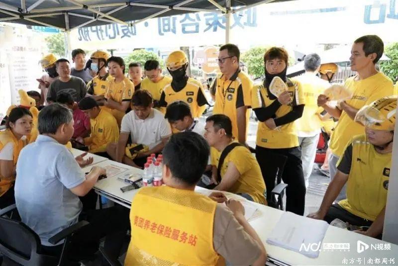 7月初,广东深圳美团骑手在街头服务站向人社部门工作人员咨询养老保险参保流程。摄影 林书明